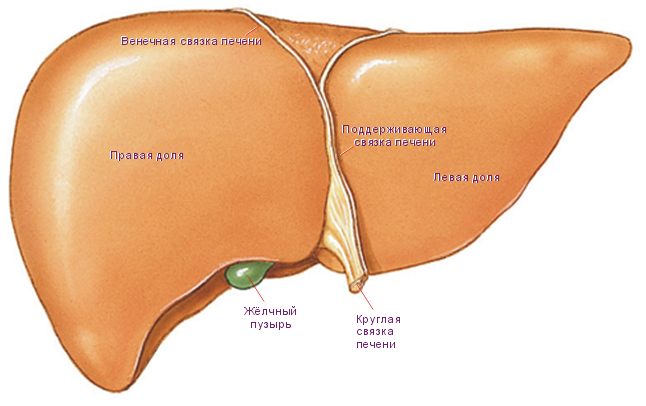 Печень – самый крупный орган пищеварительной системы. Она покрыта капсулой и расположена под правым куполом диафрагмы.