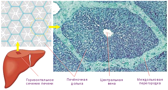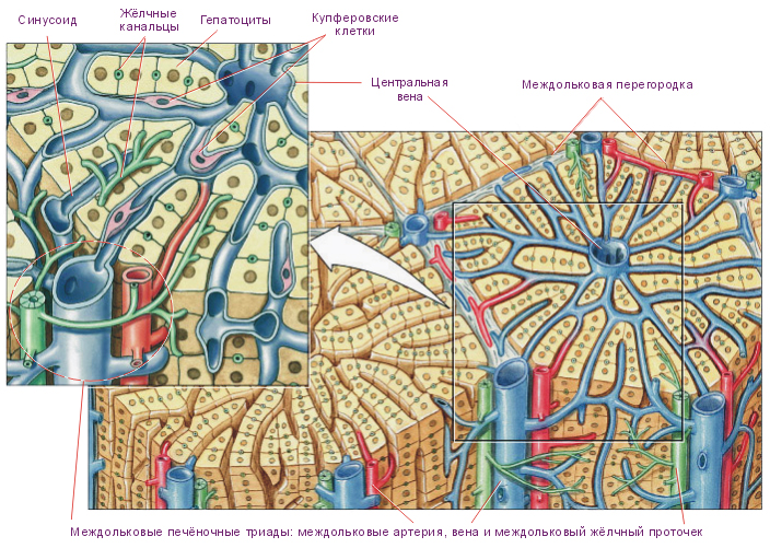 «Сердцем» каждой дольки является центральная вена. Между печеночными пластинками, радиально располагаются синусоидные капилляры. Они транспортируют кровь, которая находится на периферии дольки, в ее центр.