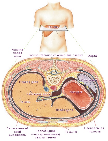 Печень расположена в правом подреберье брюшной полости, в надчревной области. Имеет неправильную форму, красно-бурый цвет и мягко-эластическую консистенцию. Масса печени взрослого человека – 1500 г.
